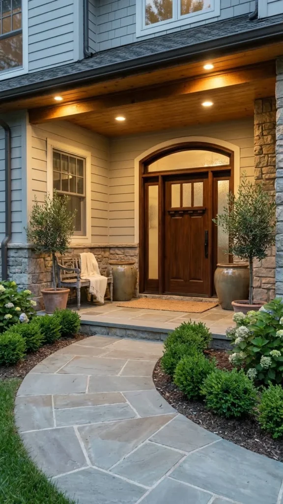 Welcome Look creates a friendly and inviting front entrance decor style. It helps guests feel comfortable when they arrive. Warm lighting and neat plants make the entryway look lively. Simple decor keeps the space clean and stylish. The front door stands out with beauty and charm. Landscaping adds natural freshness. This design improves curb appeal smoothly. Welcome Look makes the home feel pleasant and welcoming.